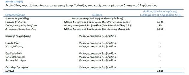 Τα 8 από τα 11 μέλη του ΔΣ συνεπώς δεν έχουν μετοχές στην τράπεζα ! Ενώ και τα άλλα 3 μέλη έχουν μόνο 6.089 μετοχές ( σε σύνολο 914 εκατομμυρίων μετοχών) αξίας σημερινής ( Χ 2,4 ΕΥΡΩ/ΜΤΧ) 14.613 ευρώ , παρά τα όσα γράφονται στην παρ 8.18 του κώδικα εταιρικής διακυβέρνησης
