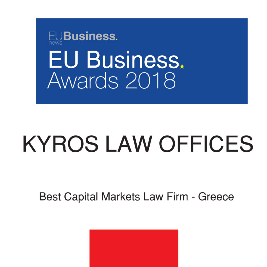 H Kyros Law Offices βραβεύεται με το EU Business Awards 2018 ως η "Καλύτερη Δικηγορική Εταιρεία στο Δίκαιο Κεφαλαιαγοράς στην Ελλάδα" (Best Capital Markets Law Firm - Greece 2018)!